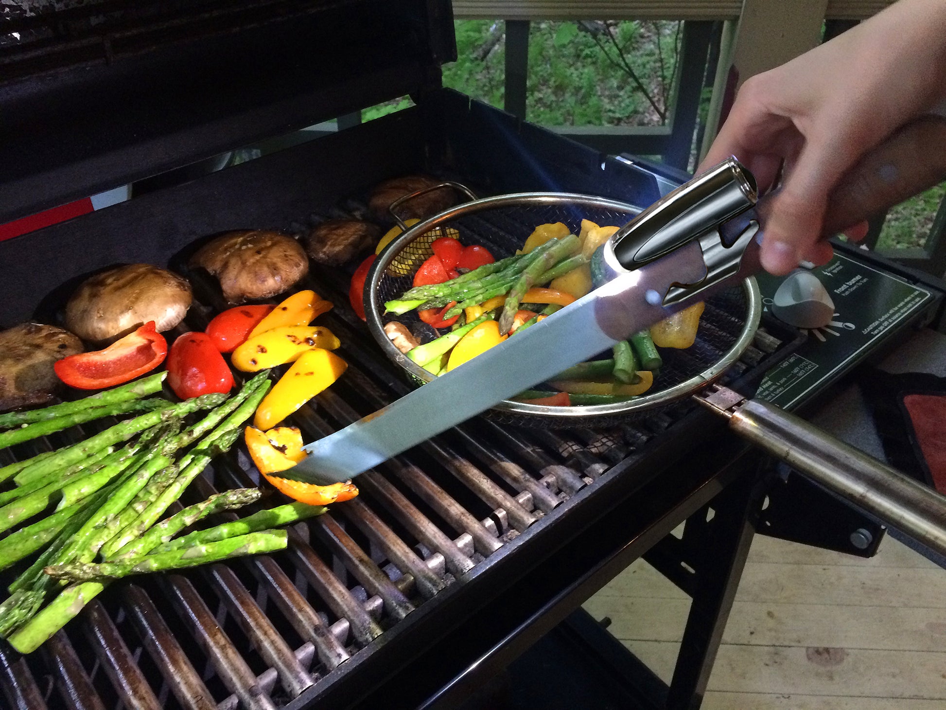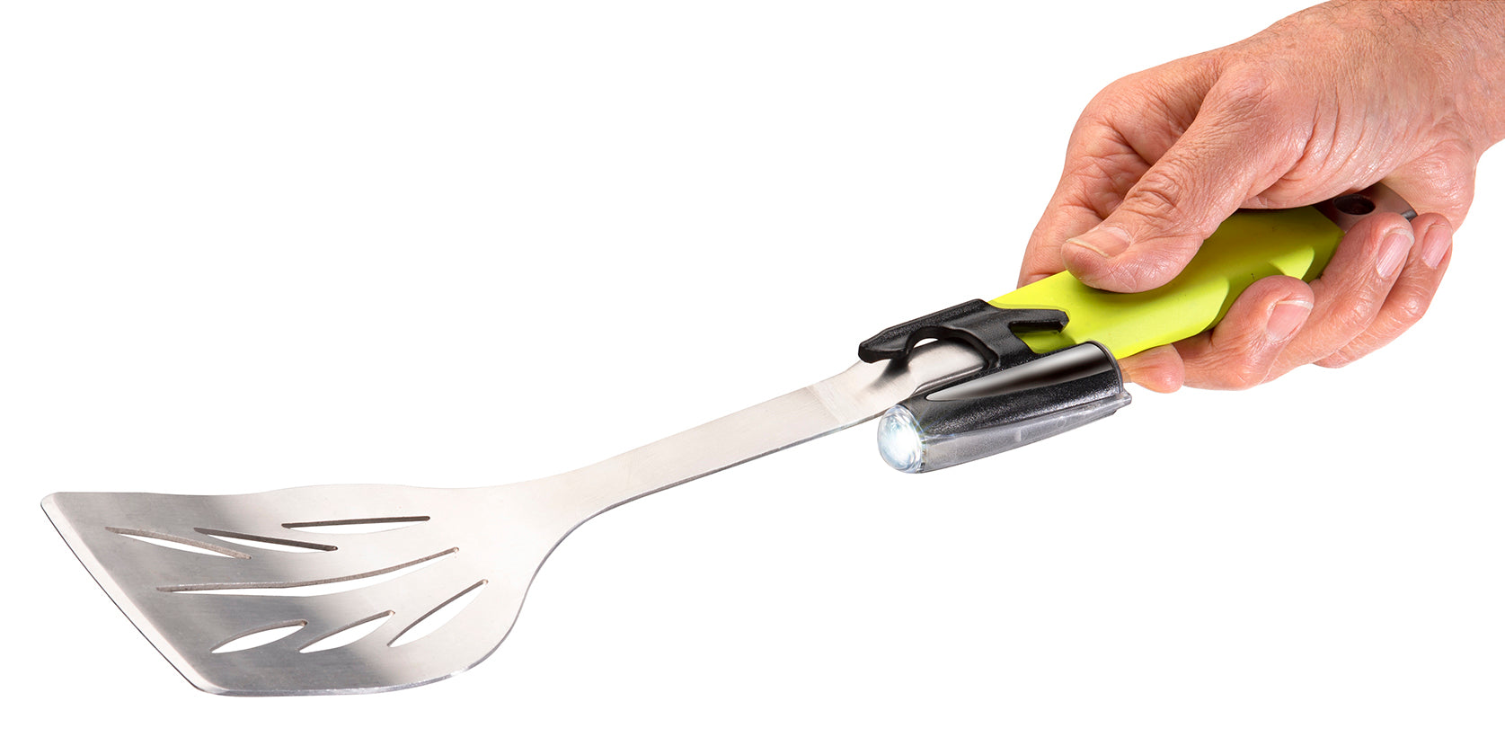• Sleek design snaps on BBQ tongs, a spatula, flipper, scraper and tools.